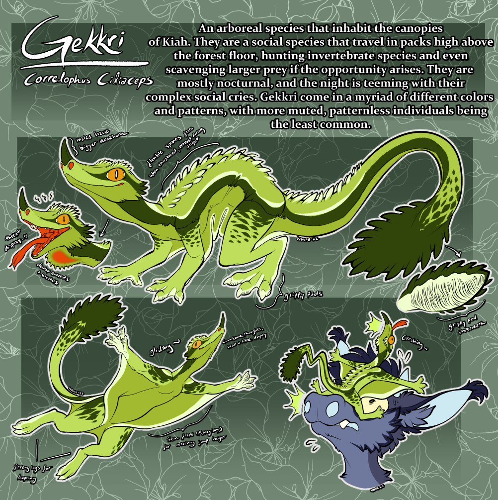 'An arboreal species that inhabit the canopies of Kiah. They are a social species that travel in packs high above the forest floor, hunting invertebrate species and even scavenging larger prey when the opportunity arises. They are mostly nocturnal, and the night is teeming with their complex social cries. Gekkri come in a myriad of different colors and patterns, with more muted, patternless individuals being the least common.'