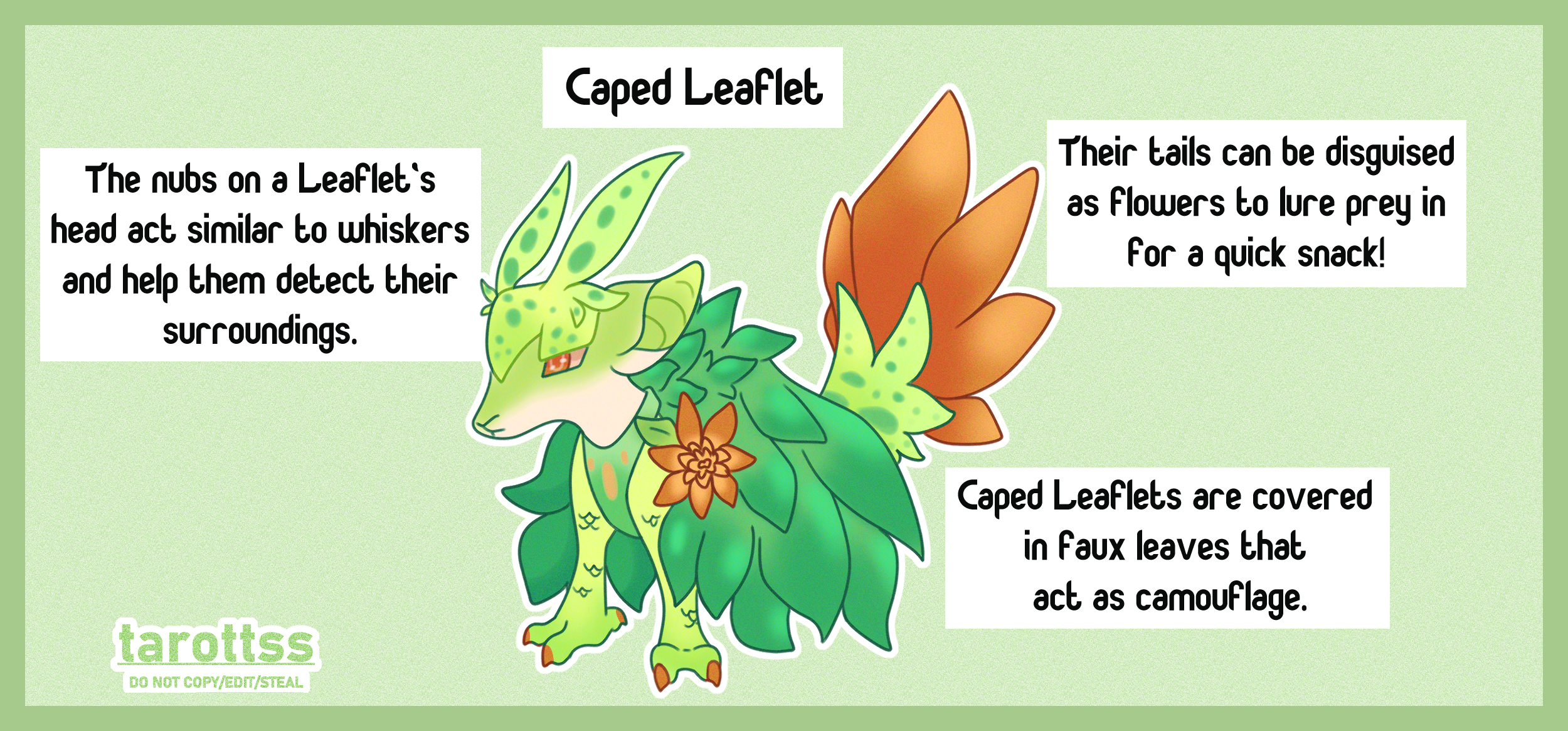 They also sport long antennae off the top of their head that work similar to whiskers on a cat, allowing them to detect vibrations and movements in their immediate vicinity. Their leafy capes also change color based on their mood; green is neutral, blue indicates sadness, yellow shows excitement or happiness, and red signals anger. When angered, they will emit a noxious odor from their nostrils, which is quite unpleasant for those around them. Caped Leaflets are able to reproduce through burying seeds that fall out of the leaf though they are very slow at doing so and usually only have one child per year.