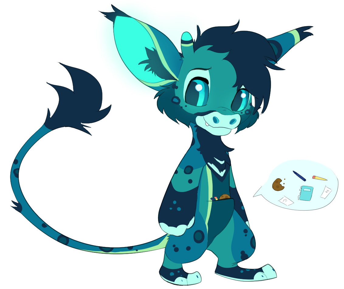 As a young xero, Verox used to dream of becoming a famous author and artist! He used to write many fanstaty stories, ranging from aliens unlike anything the xero had ever seen to castels far away on mystical planets. In addition to the xero's collection of scattered papers and notebooks in his pouch is also used to store snacks for "later", which were typically half-eaten. These snacks would get lost within the abyss of papers and pens and only found when he'd clean himself. Lets just say that these snacks were not in a edible condition when found.
