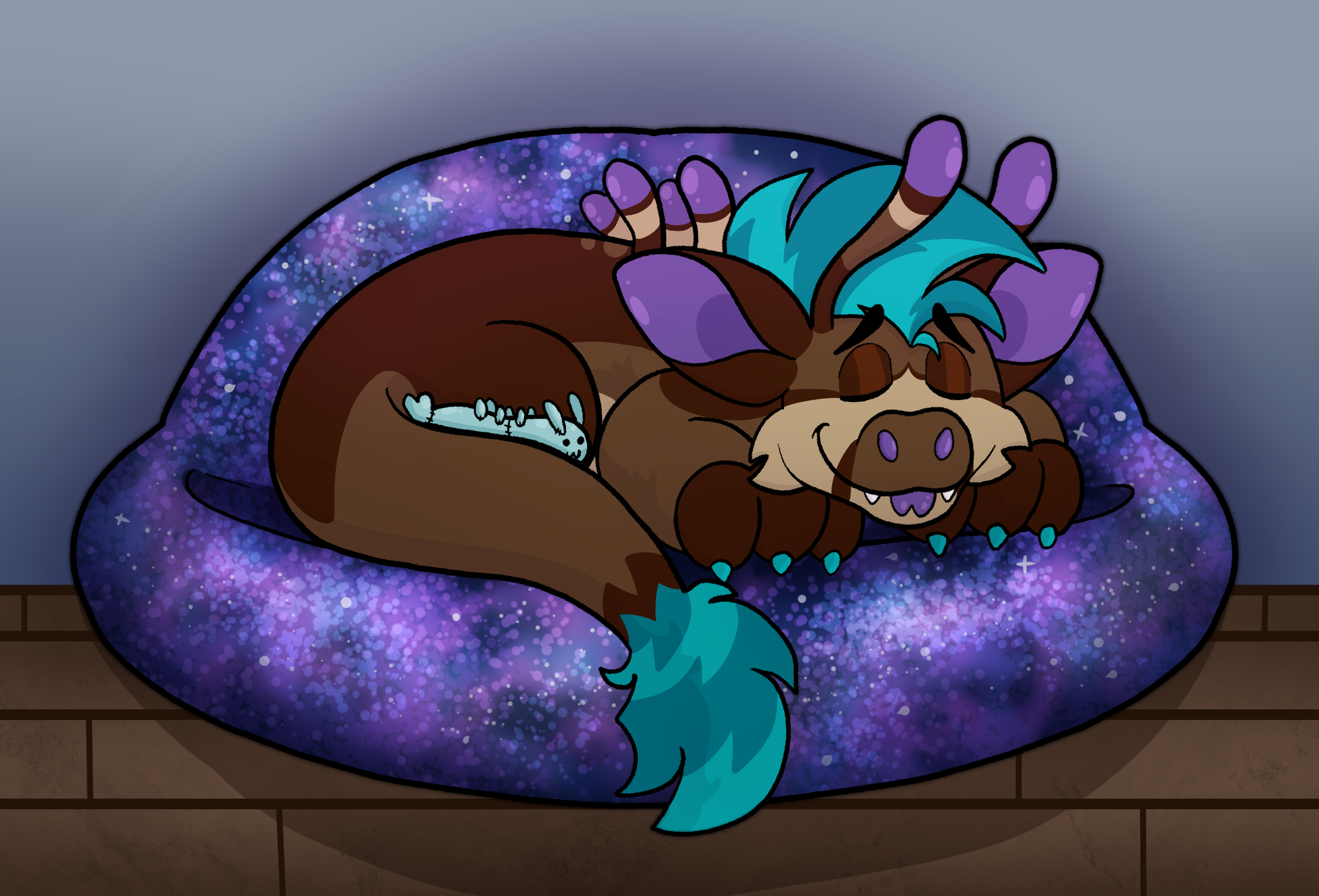 Axels bed is a biiiig galaxy themed beanbag he likes to curl up on with a Boolew plush!