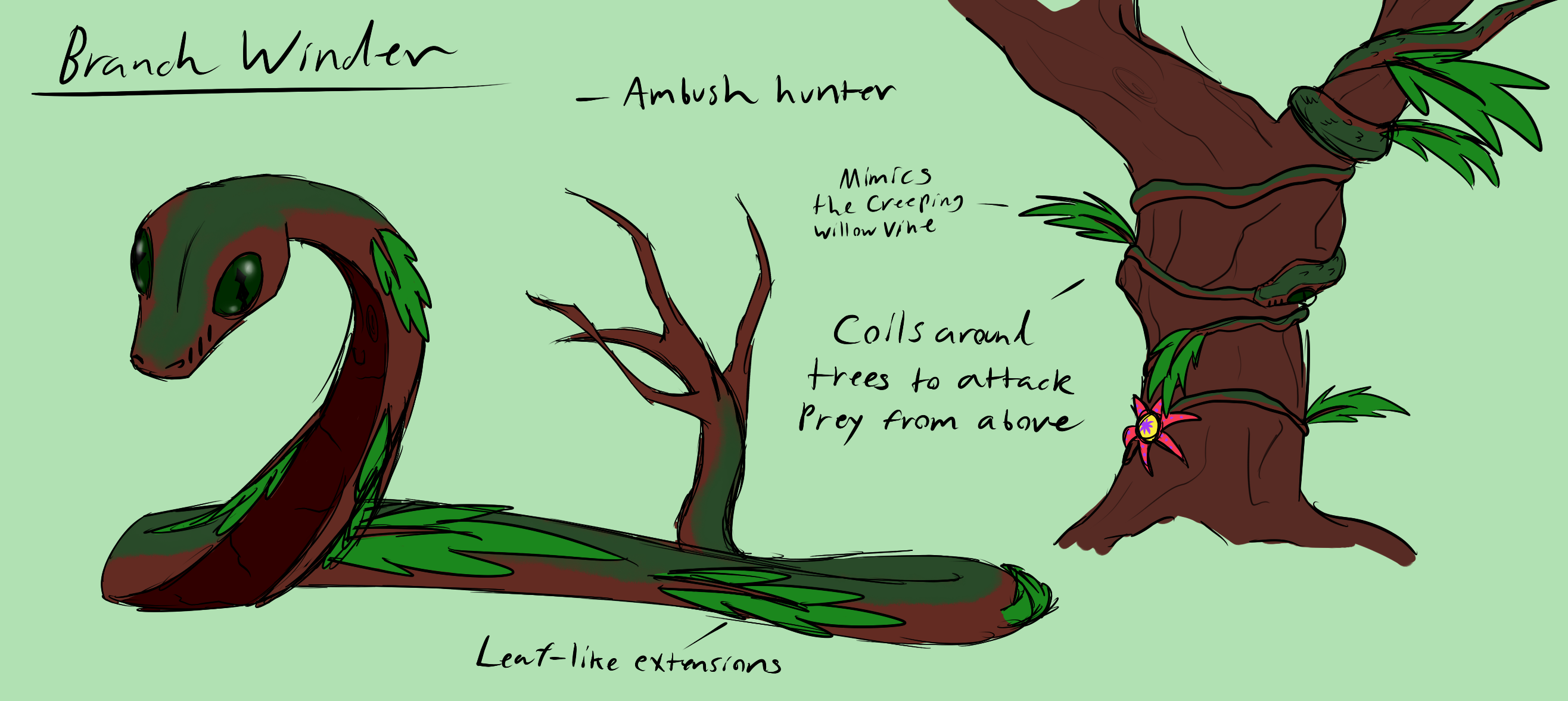Branch Winders are snake-like reptilians that ambush thier prey from above, waiting for them to come close enough before striking. To achive such a feat, they mimic the appearance of a common vine that winds up the trunks of trees called the Creeping Willow vine. Their most distinctive physical trait is their branch like protusions on their sides and tail that flair out, which is what gives them a vine/branch like appearance.