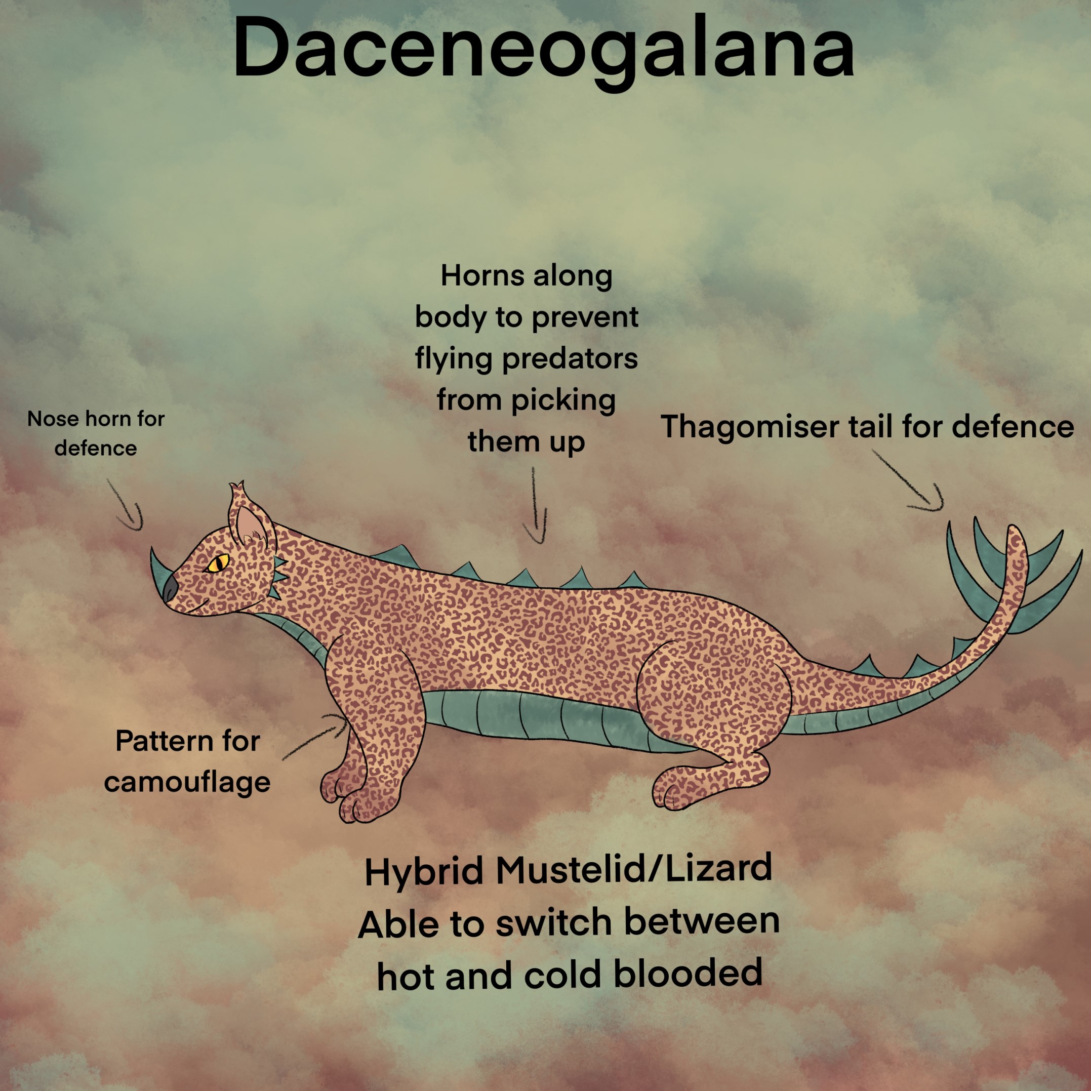 A mustelid/lizard hybrid that can adapt by changing from hot or cold blood. Its tail is a thagomiser that can be used for defence but also for breaking rocks or small trees. Horn on nose used for defence and smashing open nuts.