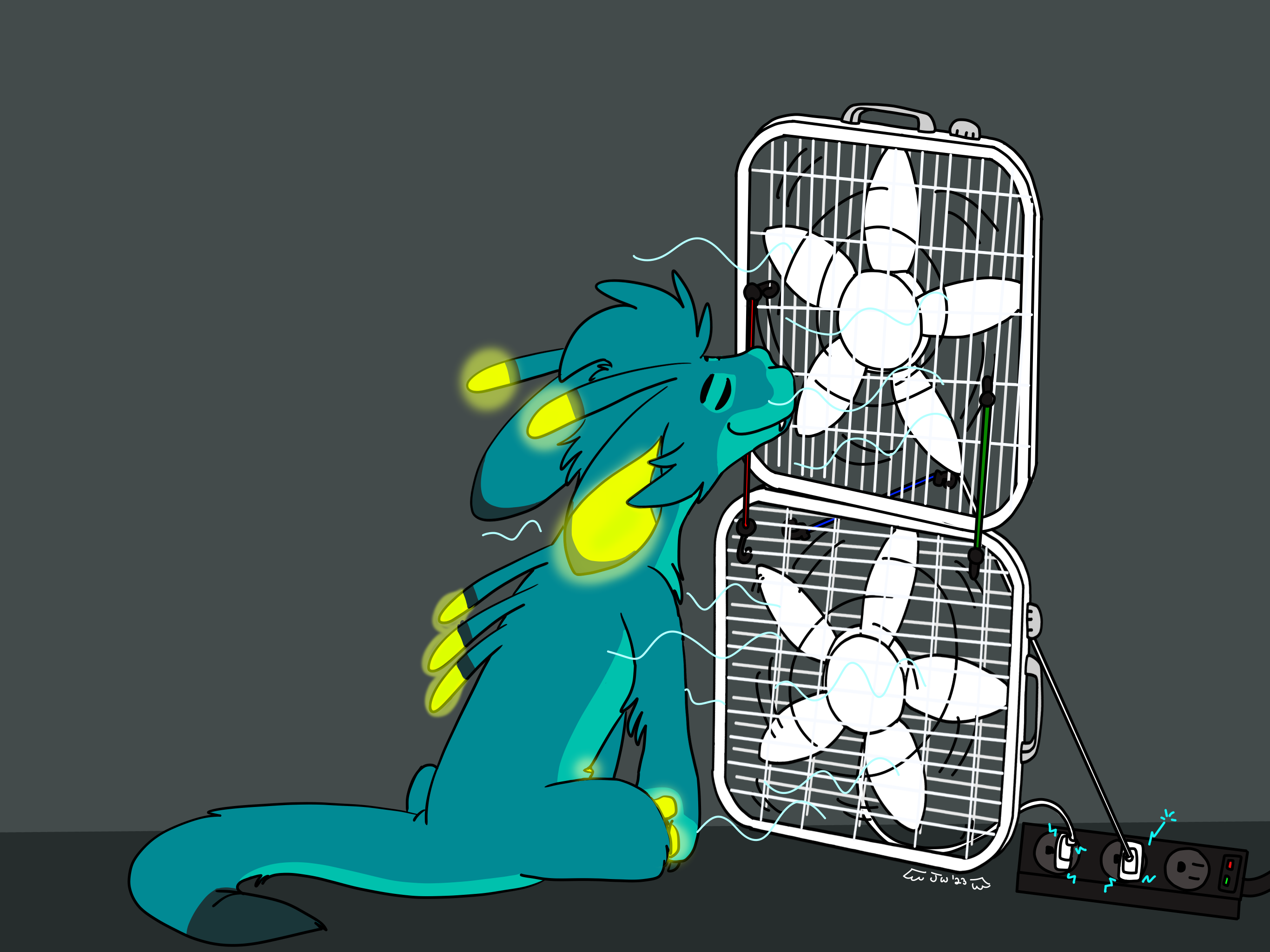 With the power of bungee cords and box fans, Ziggy's combating the heat! Might want to be careful of the power usage though...