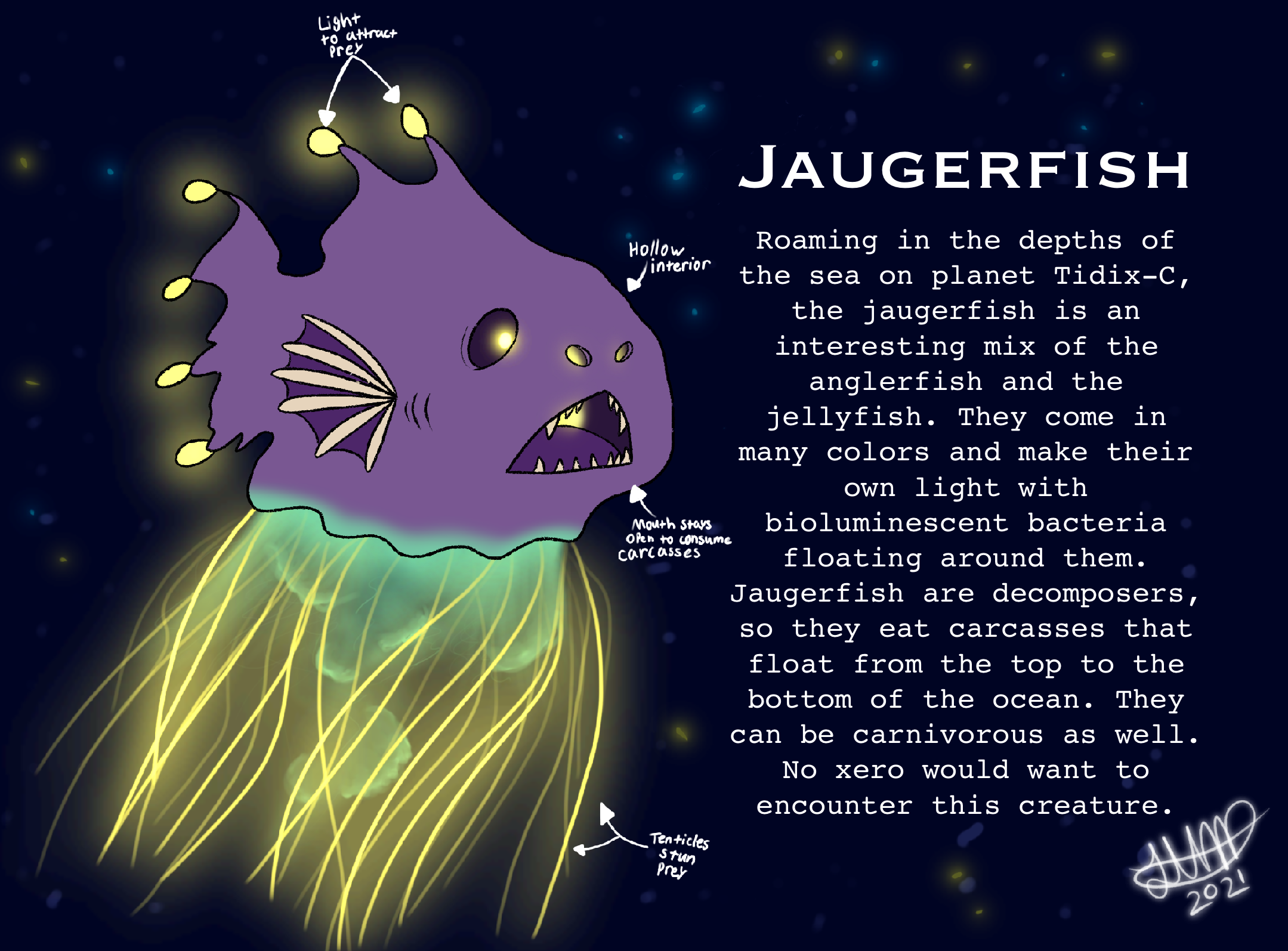 Roaming in the depths of the sea on planet Tidix-C, the jaugerfish is an interesting mix of the anglerfish and the jellyfish. They come in the colors: red, purple, green, and blue. Females are mostly red and purple and can be up to 3.5 feet in length. Males are mostly green and blue and can be up to 4 feet in length. They make their own light with bioluminescent bacteria floating around them. Jaugerfish are decomposers, so they eat carcasses that float from the top to the bottom of the ocean. They can be carnivorous as well. They keep their mouth open to consume floating carcasses and attack if they feel threatened.