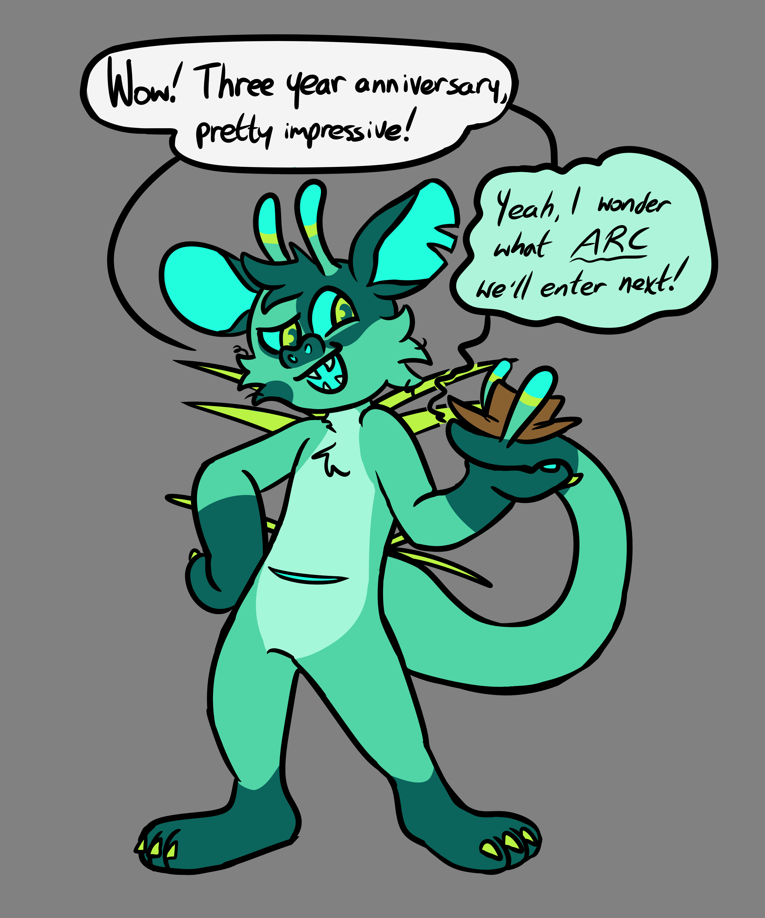 tango celebrates at the ARC anniversary party by trying out his ventriloquism act, completely unprompted and unasked for! he pulls this gag often, putting a hat on his tail and doing a silly little voice for it to try and tell jokes. nobody likes this!